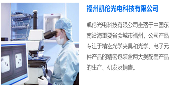 凯伦光电科技有限公司坐落于中国东南沿海重要省会城市福州,公司产品专注于精密光学夹具和光学、电子元件产品的精密包装盒两大类配套产品的生产、研发及销售。